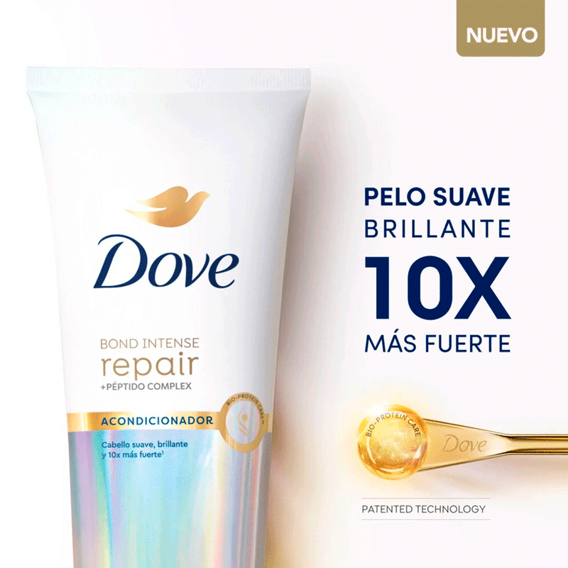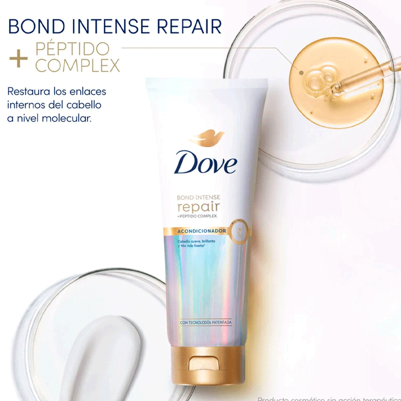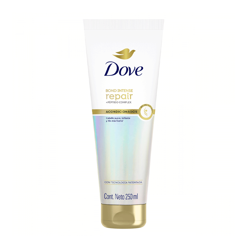 El Acondicionador Dove Bond Intense Repair viene en un envase de 250 ml, diseñado específicamente para el tratamiento de cabellos extremadamente dañados.