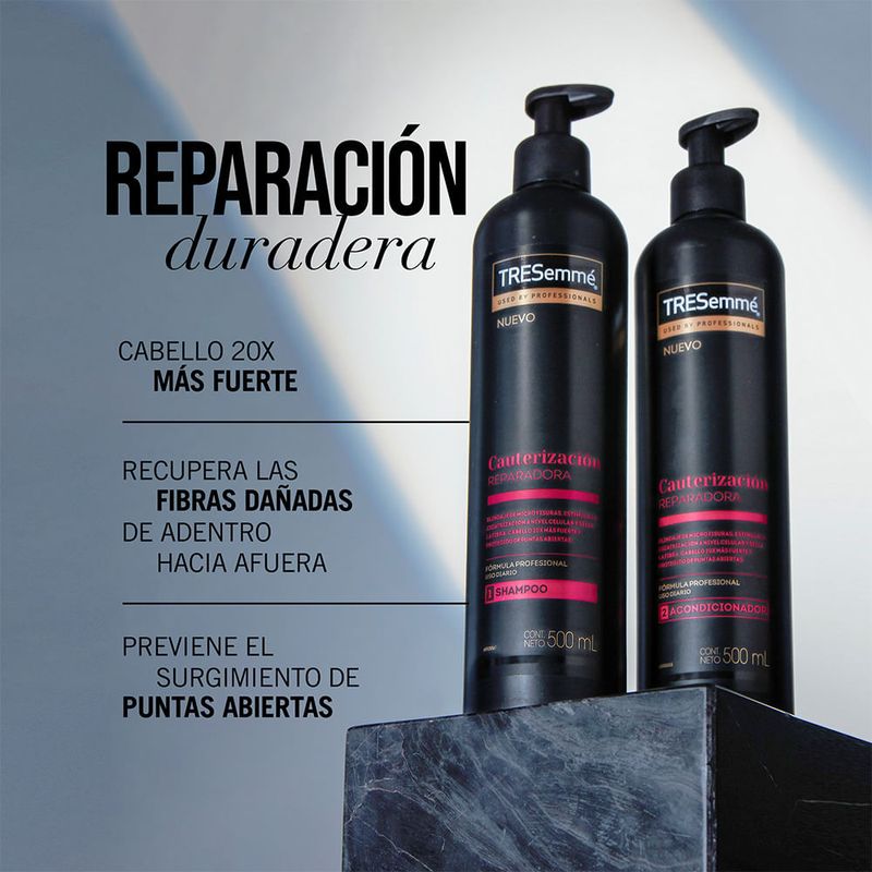 Características del producto:El Acondicionador Cauterización Reparadora de 500 ml de la marca Tresemmé está especialmente formulado para tratar y reparar el cabello dañado, brindando una hidratación profunda y mejorando la estructura capilar.