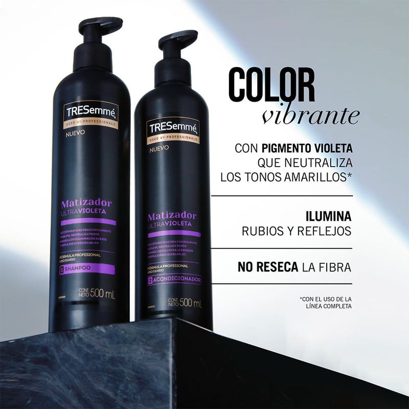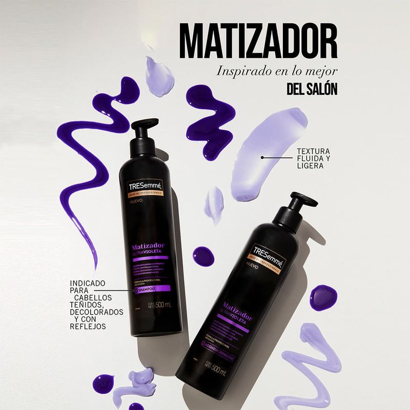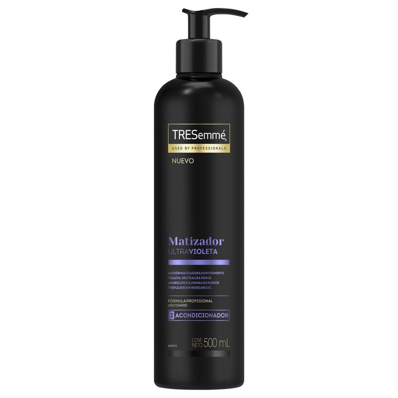 El acondicionador Tresemmé Matizador Ultravioleta posee una acción matizadores con pigmentos violetas.