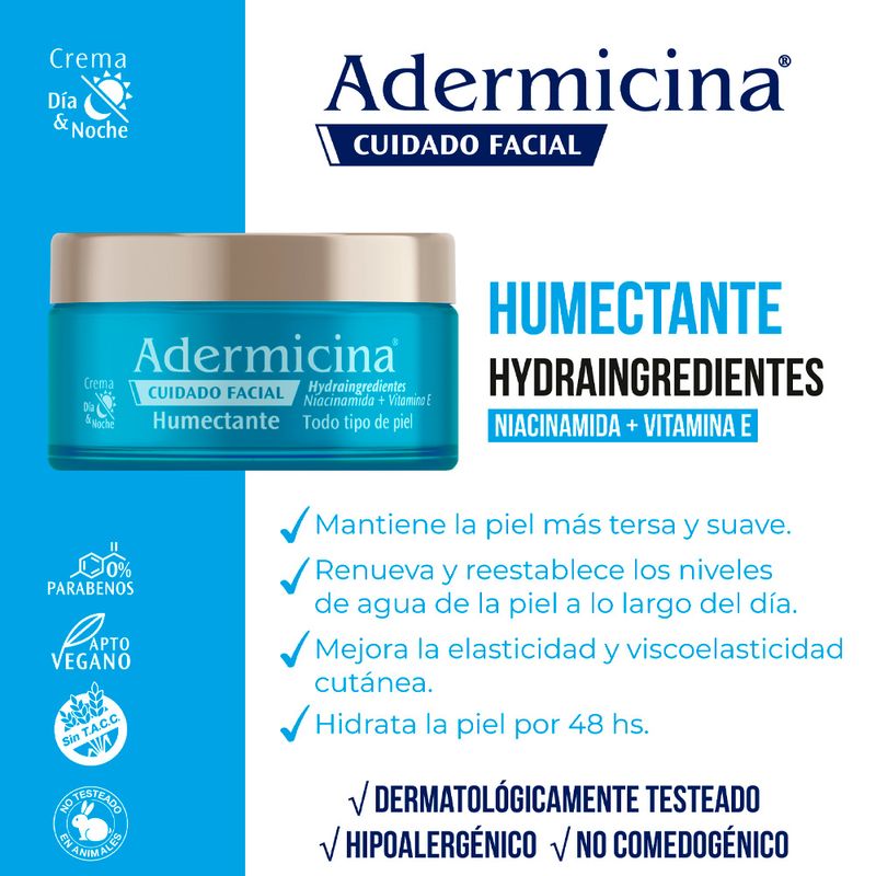 Características del producto: Adermicina Cuidado Facial Humectante está especialmente formulada para