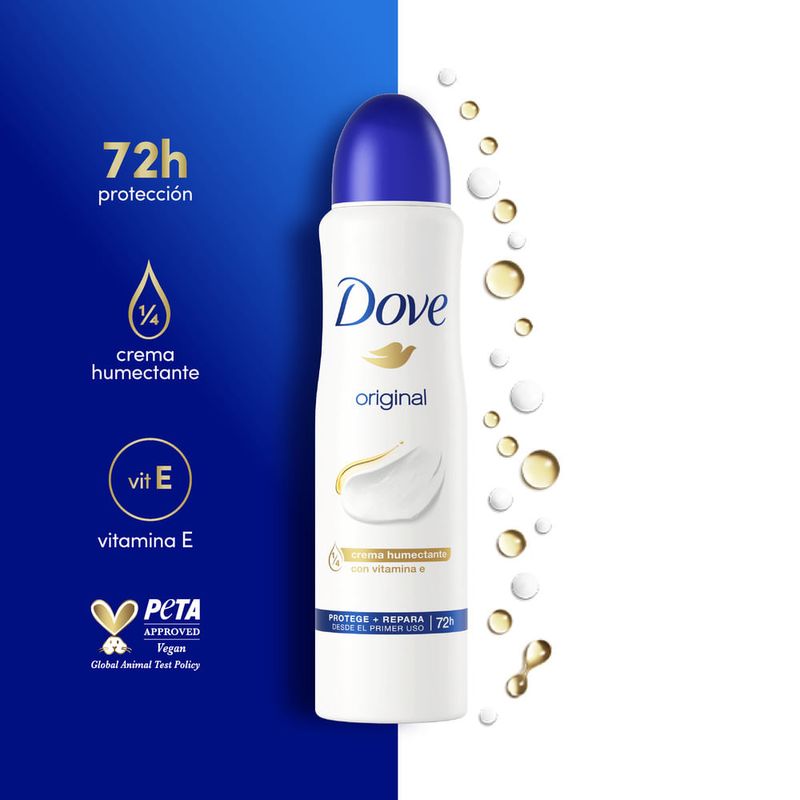 Conseguí axilas suaves, protección por 48 horas y un aroma clásico con el antitranspirante en aerosol Dove Original. 48 horas de protección y formulado con nuestra tecnología superior. Enriquecido con ¼ de nuestra crema humectante con óleo protector.