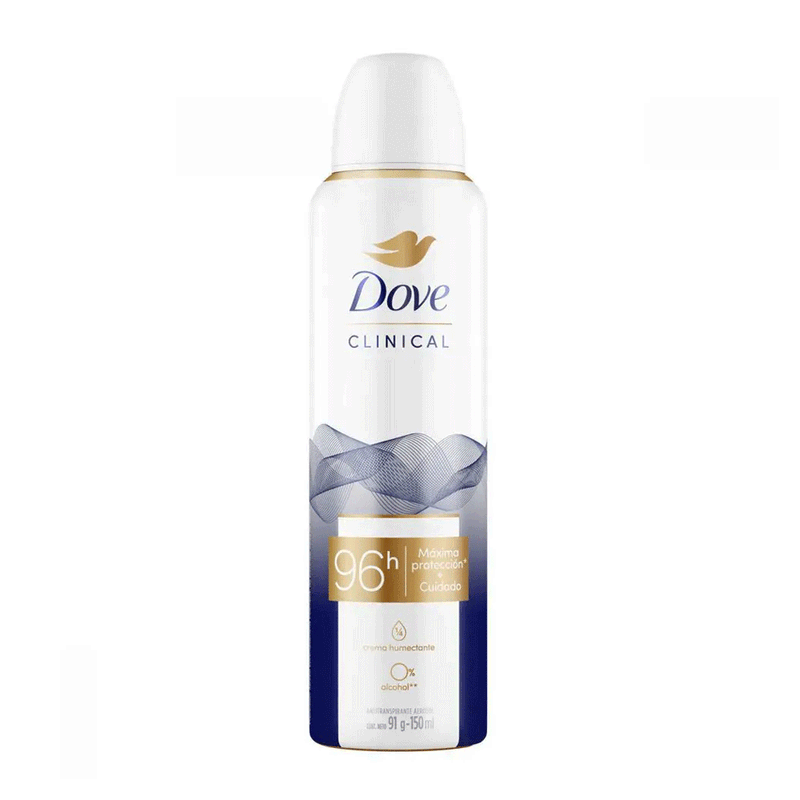 Antitranspirante en aerosol Dove Clinical 96 horas, presentación de 150 ml. Su formato en spray facilita una aplicación uniforme, rápida y sin contacto directo con la piel. Ideal para quienes buscan una protección intensiva contra la transpiración y el mal olor en situaciones de alta exigencia.