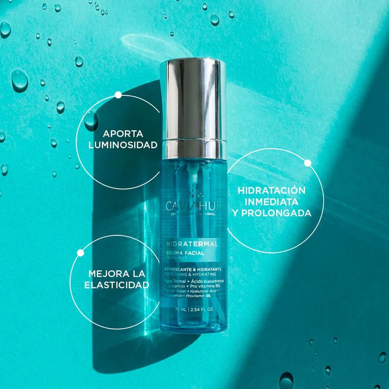 La Bruma Facial Hidratermal de Cremas Caviahue es un spray facial refrescante y revitalizante, diseñado para hidratar, tonificar y equilibrar la piel de manera inmediata.