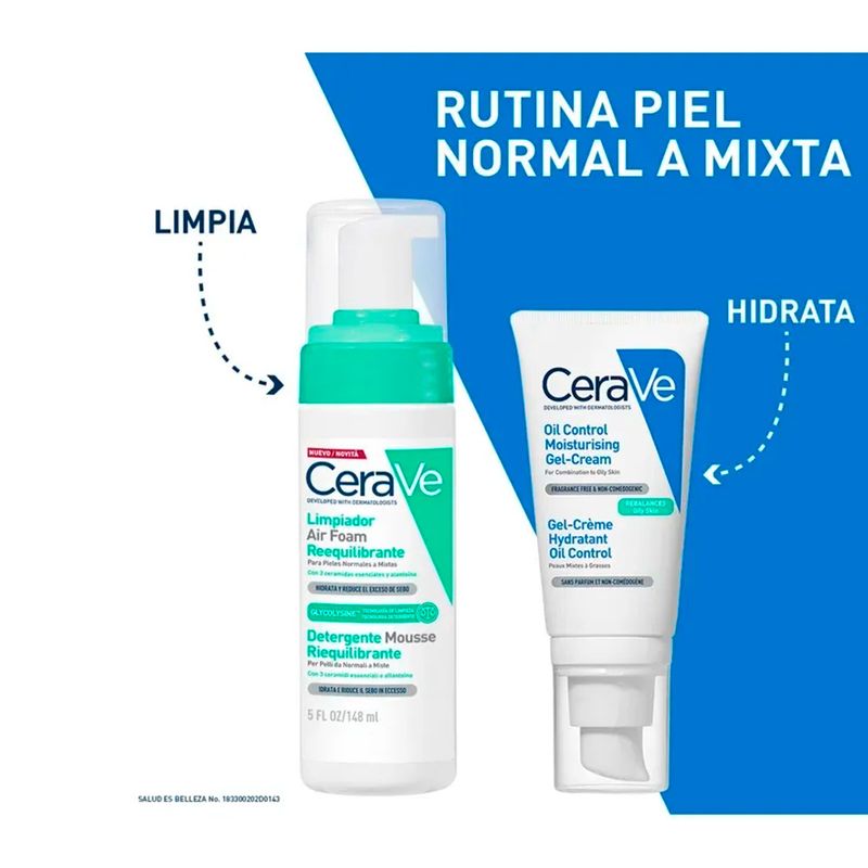 CeraVe Kit Limpiador Air Foam Reequilibrante + Gel-Crema Hidratante Oil Control ofrece una rutina facial ideal para pieles mixtas a grasas.