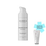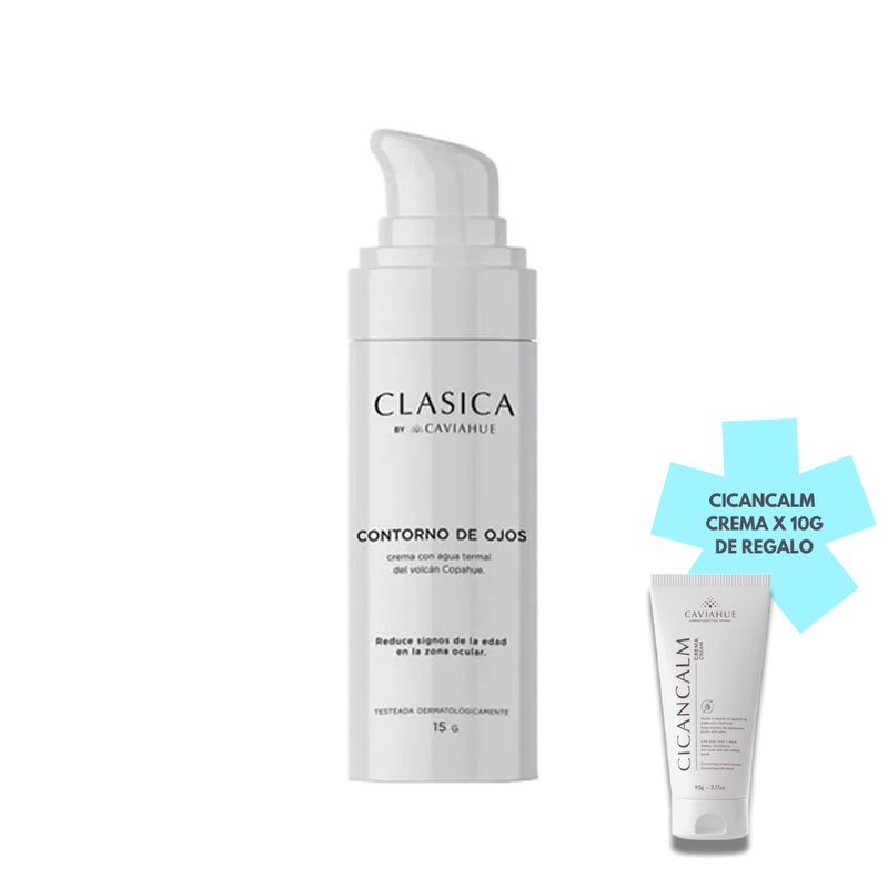 Clasica Contorno De Ojos se presenta en un envase de 15 gramos, proporcionando una cantidad necesaria para el cuidado específico de la delicada piel alrededor de los ojos.