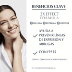 - Protección contra el sol: El factor de protección solar FPS 15 y los filtros UVA protegen la piel de los daños solares, reduciendo el riesgo de envejecimiento prematuro y la formación de nuevas arrugas.