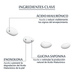 - Estimula: La Glicina Saponina, un ingrediente bioactivo, estimula la producción natural de ácido hialurónico en la piel, mejorando la hidratación y elasticidad.