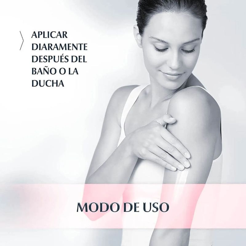 Aplicar diariamente sobre la piel limpia y seca, preferentemente después del baño o la ducha.