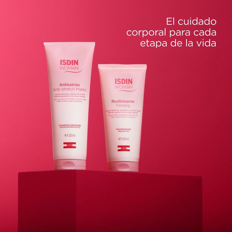 La Crema Corporal ISDIN Woman Reafirmante está diseñada para mujeres que buscan mejorar la firmeza y apariencia de su piel, especialmente en situaciones de flacidez cutánea como el postparto, adelgazamiento o distensión de la piel durante la adolescencia.