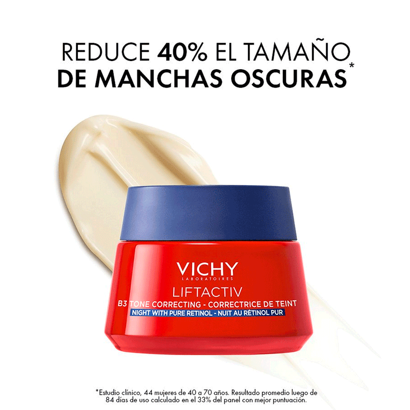 La Crema de Noche Antimanchas Liftactiv B3 de Vichy es la solución ideal para quienes buscan un tratamiento intensivo contra las manchas, apta para el uso nocturno y especialmente formulada para iluminar y rejuvenecer el rostro en cada aplicación.