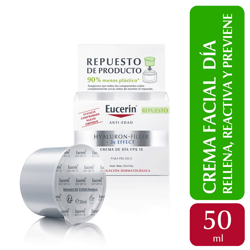 Hyaluron-Filler + 3x Effect Crema Facial de Día para Piel Seca FPS15 - Repuesto se presenta en un envase responsable que utiliza un 90% menos de plástico en comparación con el pote sin repuesto.