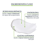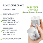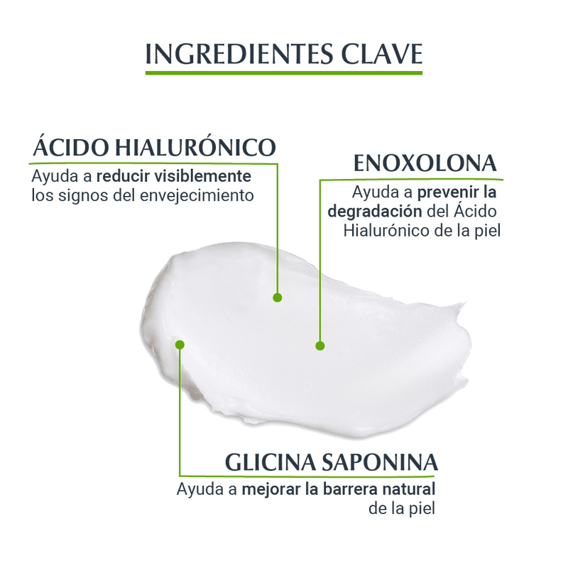 La fórmula exclusiva con Ácido Hialurónico, Saponina y Enoxolona ofrece un enfoque específico para rellenar líneas de expresión y arrugas profundas, estimulando la producción de Ácido Hialurónico propio de la piel y protegiéndola de los radicales libres.