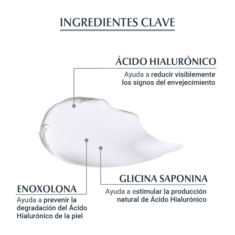 Rellena: Contiene ácido hialurónico de alto y bajo peso molecular. El ácido hialurónico de alto peso molecular actúa en las capas más externas de la piel, mejorando la hidratación y suavizando las arrugas superficiales. El ácido hialurónico de bajo peso molecular, que es 40 veces más pequeño, penetra más profundamente en la epidermis, rellenando las arrugas desde dentro.