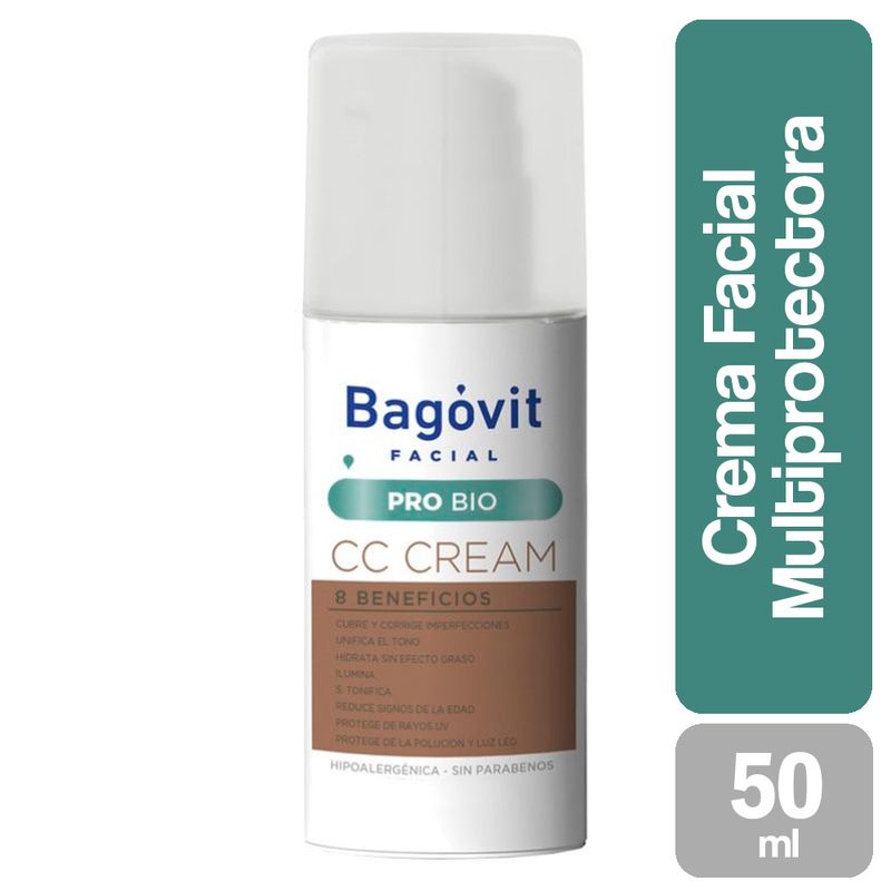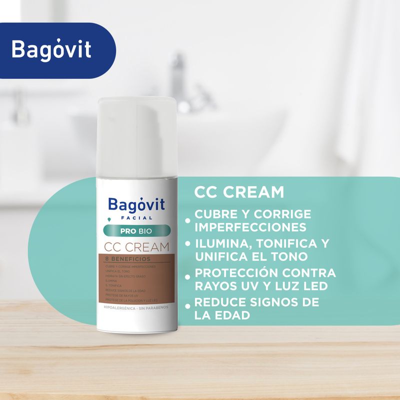 Crema Facial Multiprotectora Pro Bio CC Cream de Bagovit se presenta en un envase compacto y práctico para uso diario.