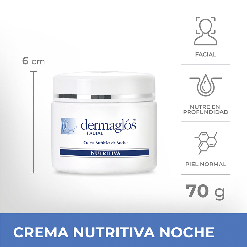 La Crema Nutritiva de Noche de Dermaglos es un tratamiento intensivo que proporciona una hidratación profunda y duradera mientras repara y revitaliza la piel durante la noche.