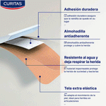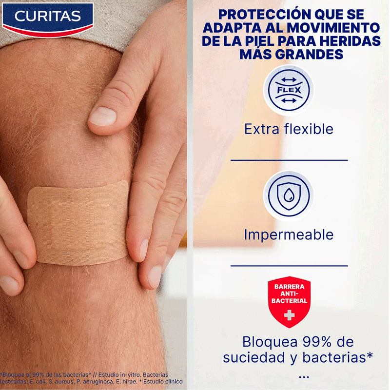Los apósitos Curitas Flexible XL son más grandes, proporcionando una cobertura superior para heridas en rodillas y codos gracias a su generoso tamaño.