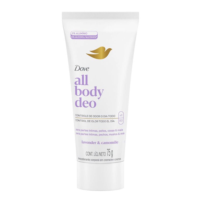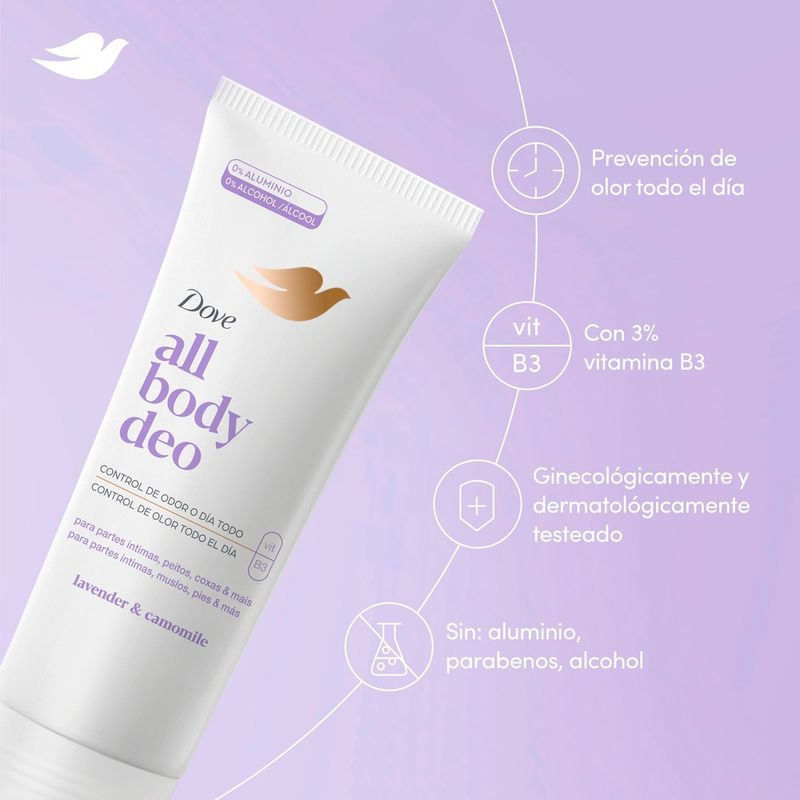 Desodorante All Body Deo Crema Dove Lavender & Camomile ofrece una protección efectiva contra el mal olor en distintas zonas del cuerpo, incluyendo partes íntimas, debajo del pecho, pliegues del abdomen, muslos, espalda y pies.