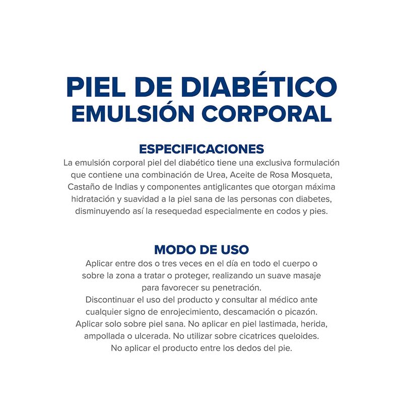 Esta emulsión corporal está especialmente formulada para proporcionar máxima hidratación y suavidad a la piel sana de las personas con diabetes.