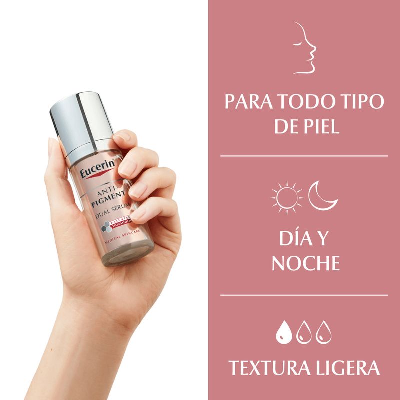 Serum Facial Anti-Pigment Dual Eucerin (7319470066786) Fórmula de doble acción con Thiamidol®, ingrediente patentado que actúa en el origen de la hiperpigmentación. Ayuda a reducir manchas oscuras y unificar visiblemente el tono de la piel, con textura liviana y rápida absorción.