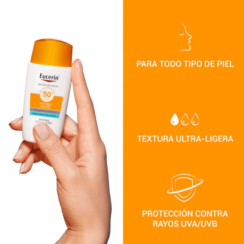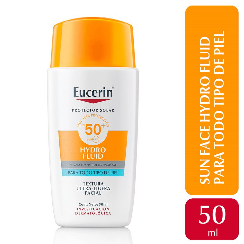 Protector Solar Facial Hydro Fluid FPS 50+ Eucerin (4005900994776) Fotoprotector diario de textura ultraligera que protege eficazmente frente a rayos UVA, UVB y luz visible. Hidrata sin dejar sensación grasosa y es ideal para el uso diario, incluso en pieles sensibles.