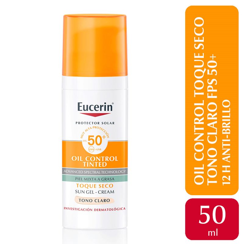 Protector Solar Facial Oil Control Tinted Tono Claro FPS 50+ Eucerin (4005900839626) Fotoprotector con color de muy alta protección. Controla el brillo, unifica el tono y ofrece un acabado natural y mate, ideal para piel mixta a grasa.