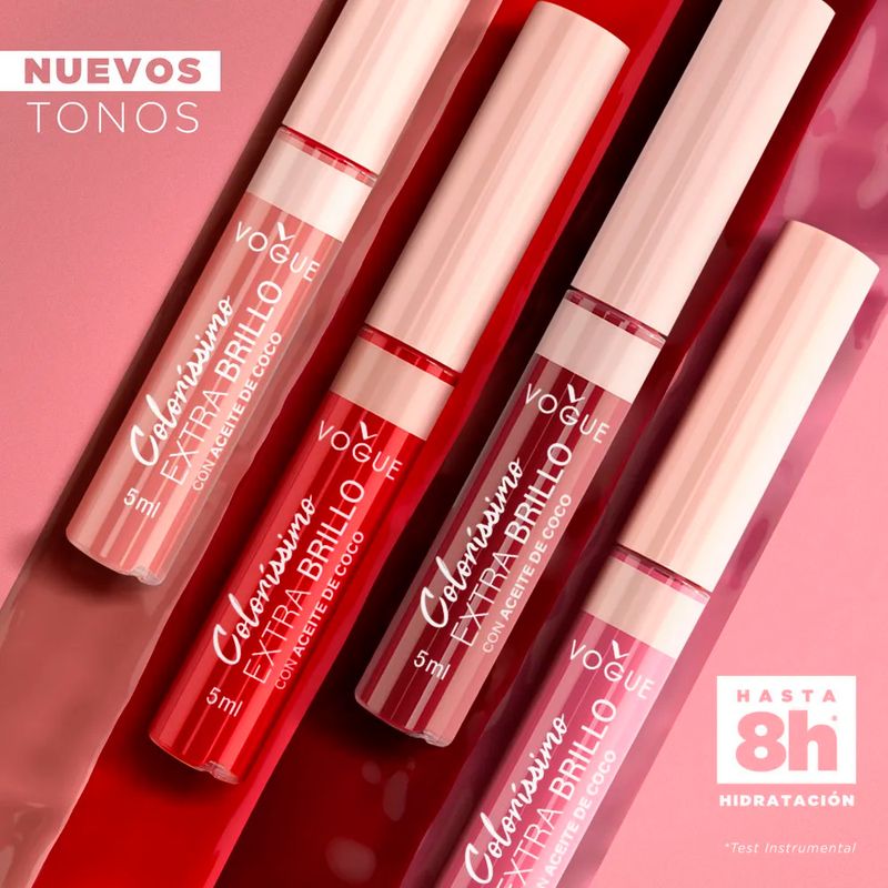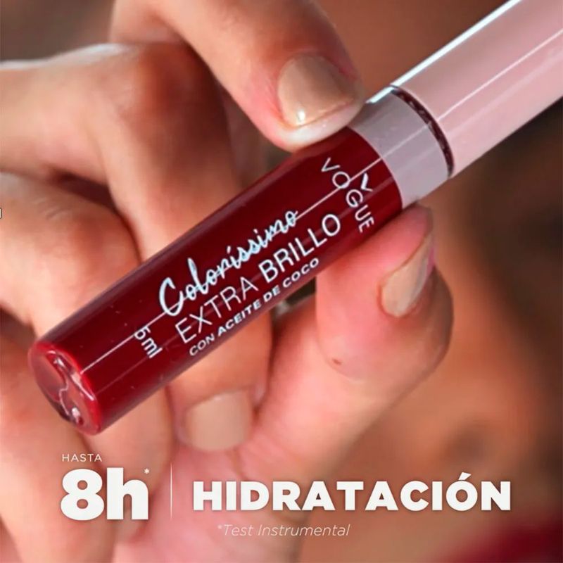 El Labial Colorissimo Extra Brillo brinda un acabado ultra luminoso con un efecto de volumen instantáneo.