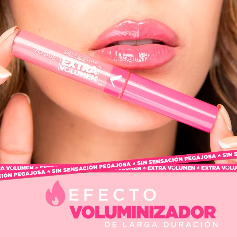 Labial Líquido Vogue Colorissimo Extra Volumen realza los labios con un brillo intenso y un efecto de volumen instantáneo.