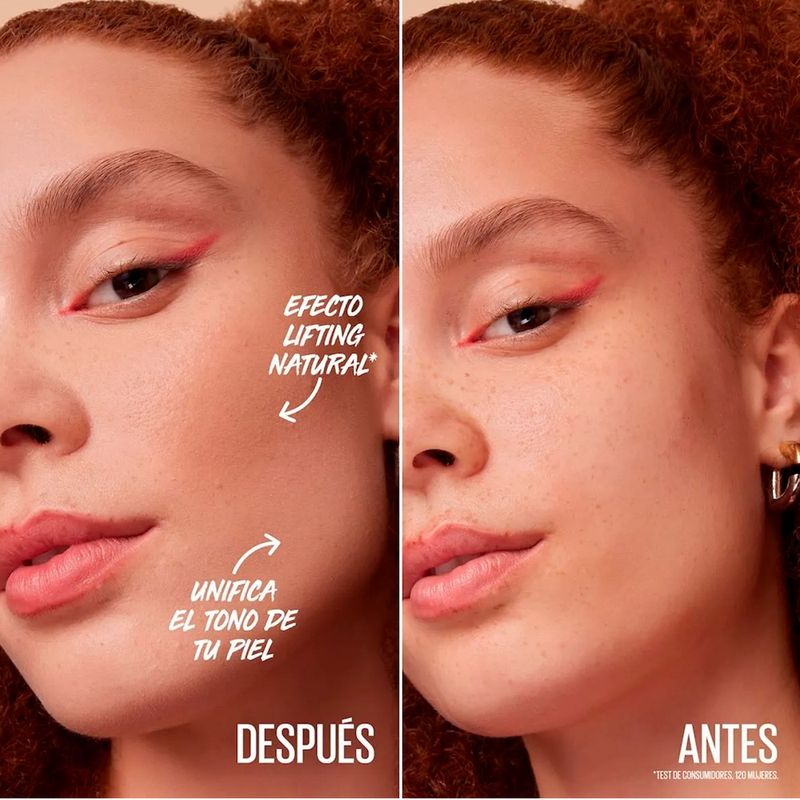 Fórmula cremosa de alta deslizabilidad que se integra fácilmente a la piel, permitiendo una aplicación uniforme y un acabado natural con efecto lifting visible, según test de consumidoras.