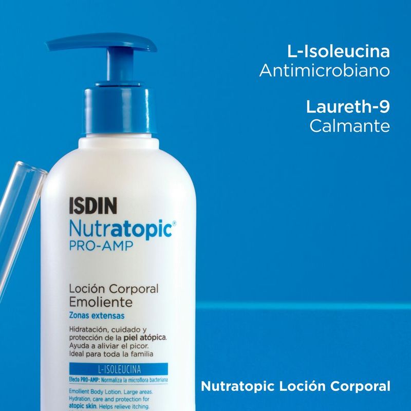 La Loción Corporal Emoliente Nutratopic Pro-AMP de ISDIN está diseñada para brindar un cuidado integral a la piel atópica, ofreciendo múltiples beneficios gracias a su formulación avanzada.