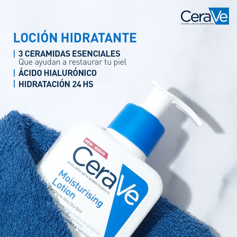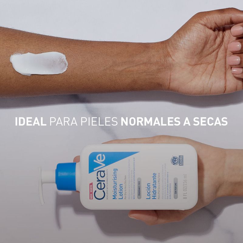 La Loción Hidratante CeraVe está diseñada para piel normal a seca, ofreciendo una fórmula ligera y sin aceites.