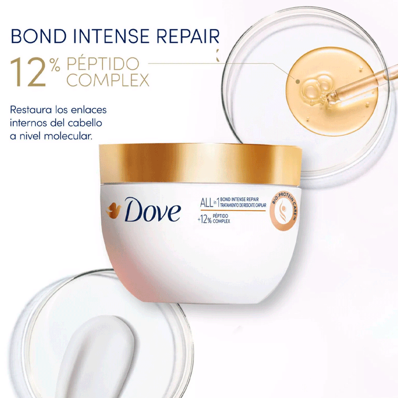 La Máscara de Tratamiento Dove Bond Intense Repair actúa en tan solo 1 minuto, ayudando a revertir hasta 10 signos de daño, incluyendo puntas abiertas, quiebre, falta de brillo y elasticidad.