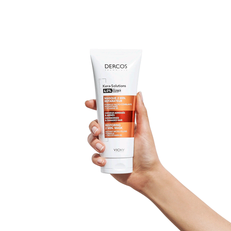 La Mascarilla Reparadora 2 Minutos Dercos Kera-Solutions de Vichy está diseñada para restaurar y revitalizar el cabello dañado y castigado por factores como el envejecimiento, los rayos UV, y agresiones mecánicas, térmicas y químicas.