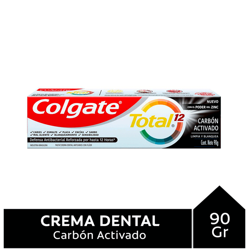 La Pasta Dental Colgate Total 12 Carbón Activado se presenta en tubo de 90 gramos, ideal para uso diario. Su fórmula avanzada combina la tecnología Total 12, que ofrece protección integral durante 12 horas, con carbón activado, un ingrediente reconocido por su acción purificante y su capacidad de ayudar a eliminar manchas superficiales. Tiene una textura cremosa y sabor fresco.