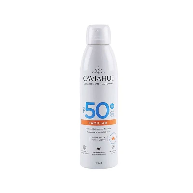 El Protector Solar FPS 50 Familiar Caviahue viene en un envase en aerosol de 200 ml, diseñado para uso en cuerpo y rostro.