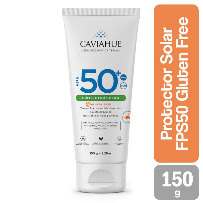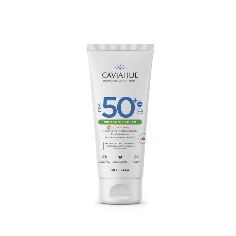 El Protector Solar FPS 50 Gluten Free Caviahue viene en un envase de 200 ml, ideal para uso en rostro y cuerpo.