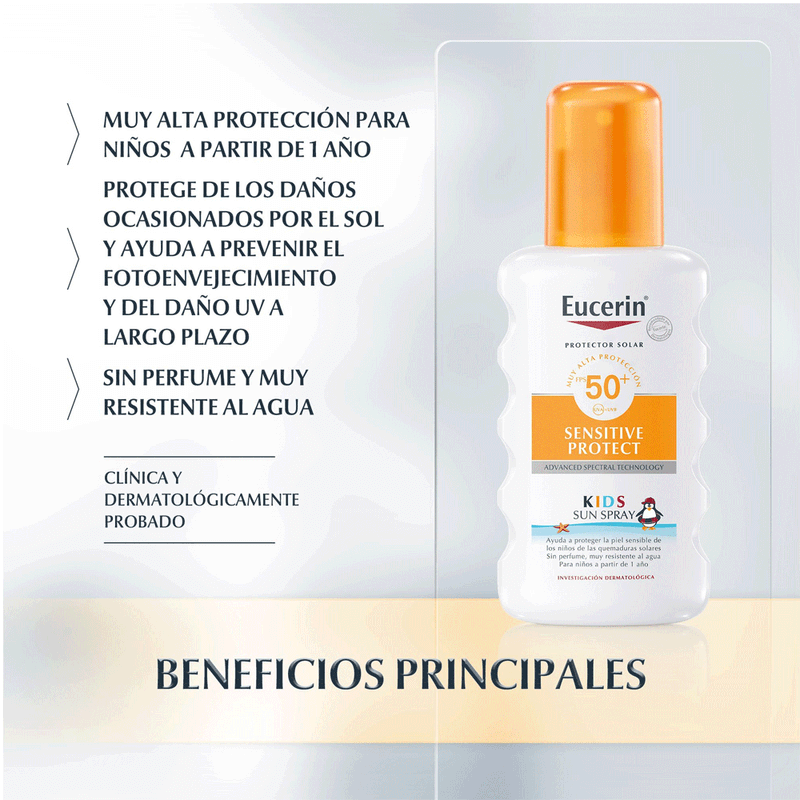 Es un spray de fácil aplicación, no grasoso y resistente al agua, especialmente desarrollado para proteger la piel sensible de los niños mayores de 1 año contra los daños solares.