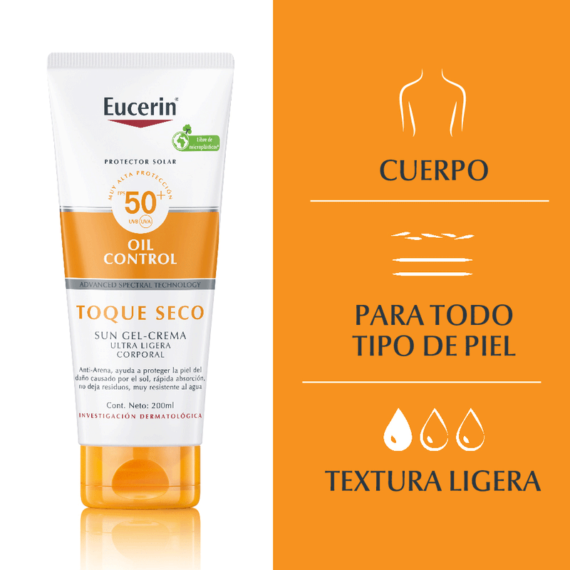 El Protector Solar Sun Body Oil Control Gel-Crema Toque Seco FPS 50+ de Eucerin es un protector solar corporal innovador, formulado para proporcionar una protección superior y un confort excepcional.
