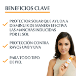Ofrece una muy alta protección UVA/UVB y ayuda a prevenir la hiperpigmentación inducida por el sol.
