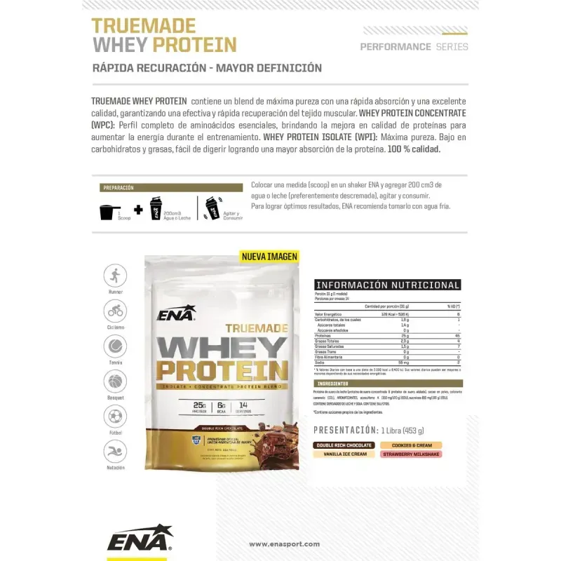 La Proteína Whey Protein Sabor Chocolate True Made ENA 453 g está formulada con proteína concentrada de suero de leche, de alta calidad y rápida absorción, ideal para favorecer la recuperación muscular después del ejercicio, mejorar el rendimiento y mantener una nutrición equilibrada. Su sabor intenso a chocolate la convierte en un suplemento delicioso y fácil de incorporar a tu rutina diaria.