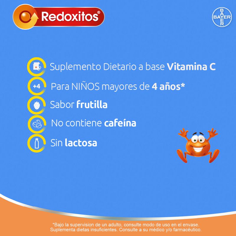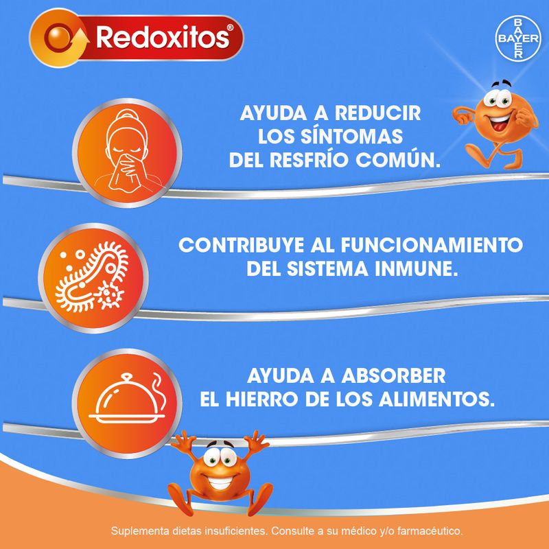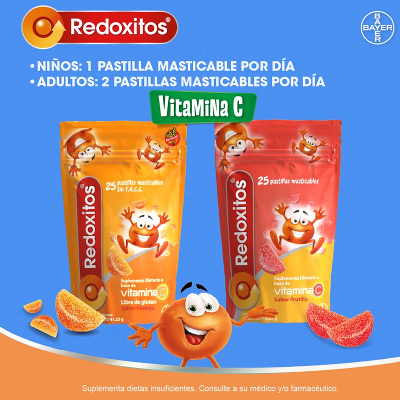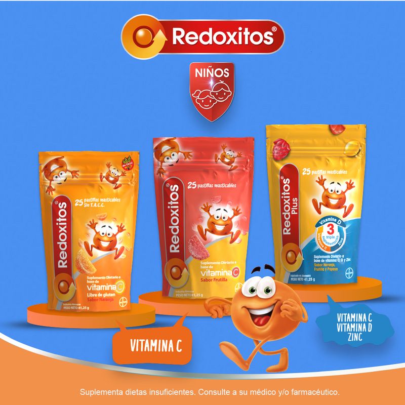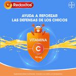 Cada pastilla de Redoxitos contiene la dosis adecuada de Vitamina C que ayuda a tu hijo a mantenerse saludable y estar protegido durante todo el año.