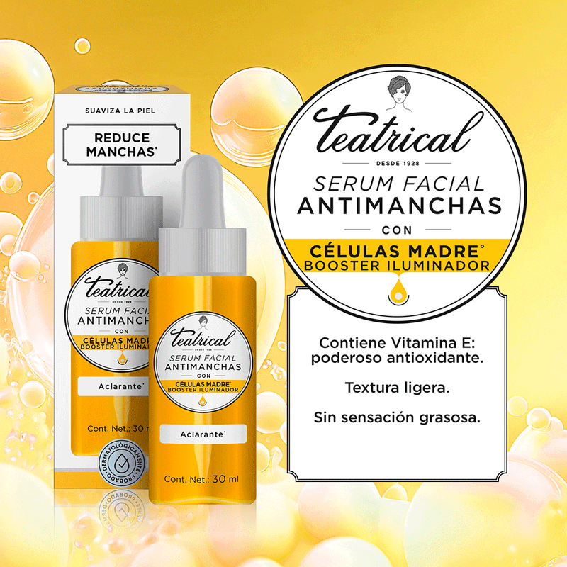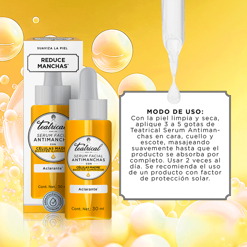 El Serum Antimanchas de Teatrical combina tecnología avanzada con ingredientes activos para aclarar y suavizar la piel, reduciendo visiblemente las manchas superficiales.