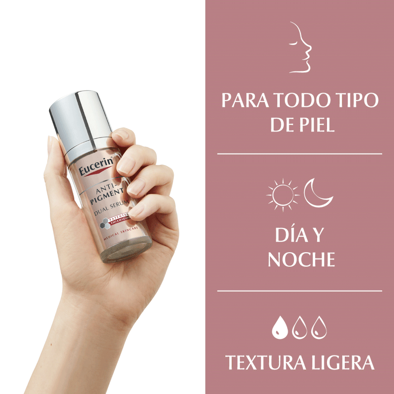 El Serum Facial Anti-Pigment Dual Serum de Eucerin es un tratamiento dermatológico avanzado diseñado para combatir eficazmente la hiperpigmentación y renovar la apariencia de la piel.