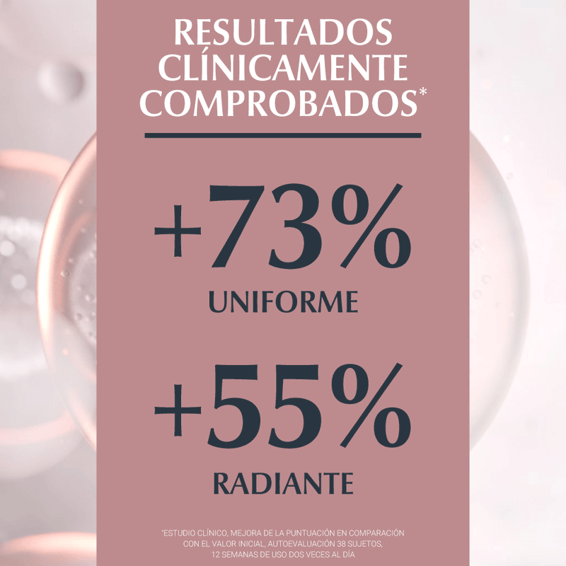 Este producto está clínicamente y dermatológicamente probado para brindar resultados visibles en tan solo dos semanas de uso continuo, mejorando la textura de la piel y reduciendo la hiperpigmentación de manera efectiva.