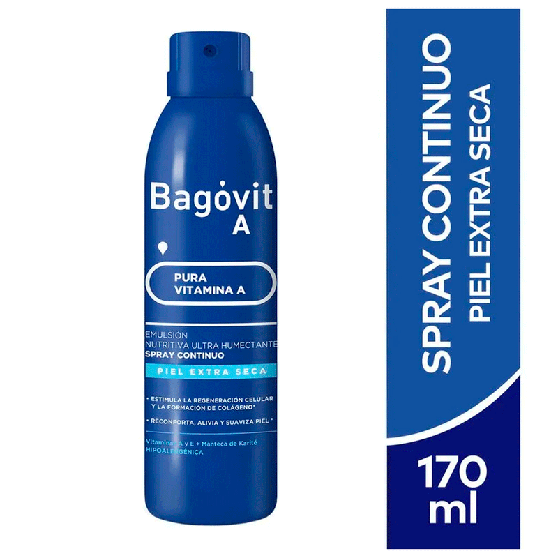 El Spray Continuo Piel Extra Seca Bagovit combina una fórmula nutritiva y reparadora con Vitamina A, Manteca de Karité y Vitamina E, diseñada especialmente para pieles muy secas.