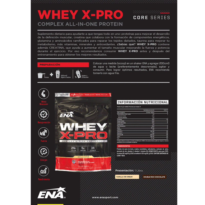 Whey X-Pro de ENA es un suplemento de proteínas diseñado para satisfacer las necesidades nutricionales de quienes buscan aumentar su masa muscular y mejorar su rendimiento físico.