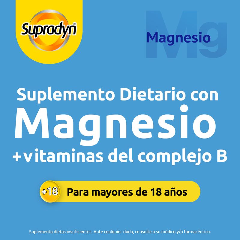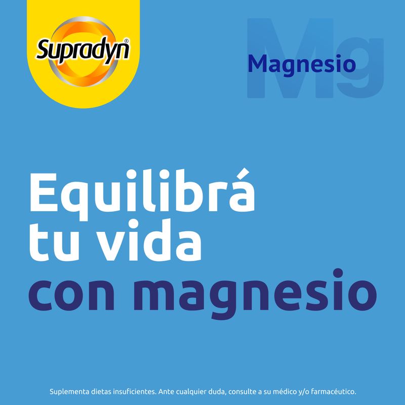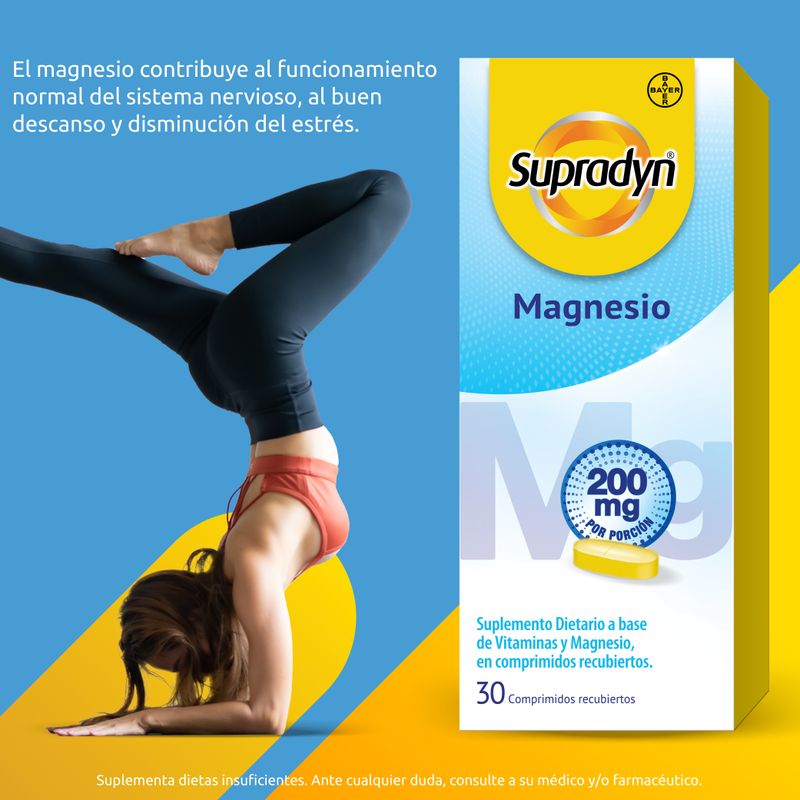 Supradyn Magnesio de Bayer es un suplemento dietario con magnesio y vitaminas del complejo B que ayudan al rendimiento físico y al bienestar general, aportando equilibrio para el cuerpo y la salud.