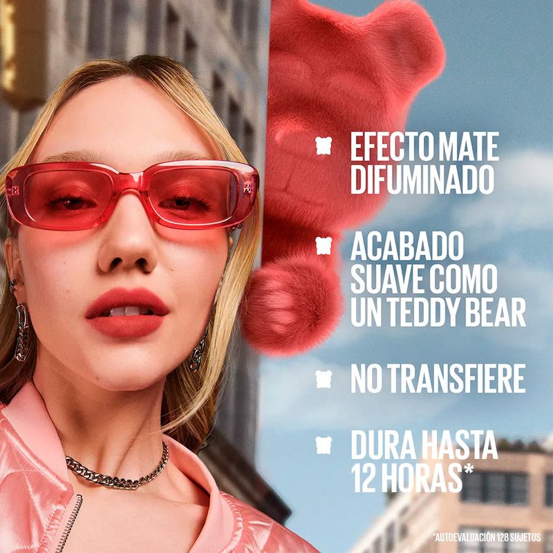 Características del producto: La Tinta Líquida Superstay Teddy Tint de Maybelline New York ofrece un acabado mate difuminado y aterciopelado, con una textura liviana y cómoda que se funde con los labios.