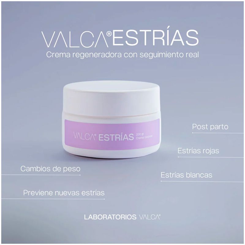 Características del producto: Valca Estrías® es un tratamiento corporal formulado para mejorar visiblemente la apariencia de estrías nuevas y antiguas.